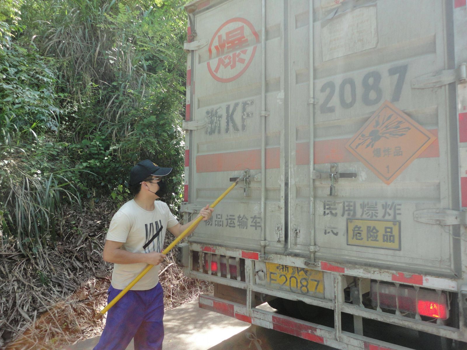 5月24日下午14時,民爆物品進(jìn)庫車行駛至總庫區(qū)某處偏僻地段,被前面一輛面包車及道路中間的障礙物擋住去路,一名押運(yùn)員下車查看情況,突然兩名蒙面“歹徒”持刀沖出,開始了預(yù)謀已久的搶劫行動……